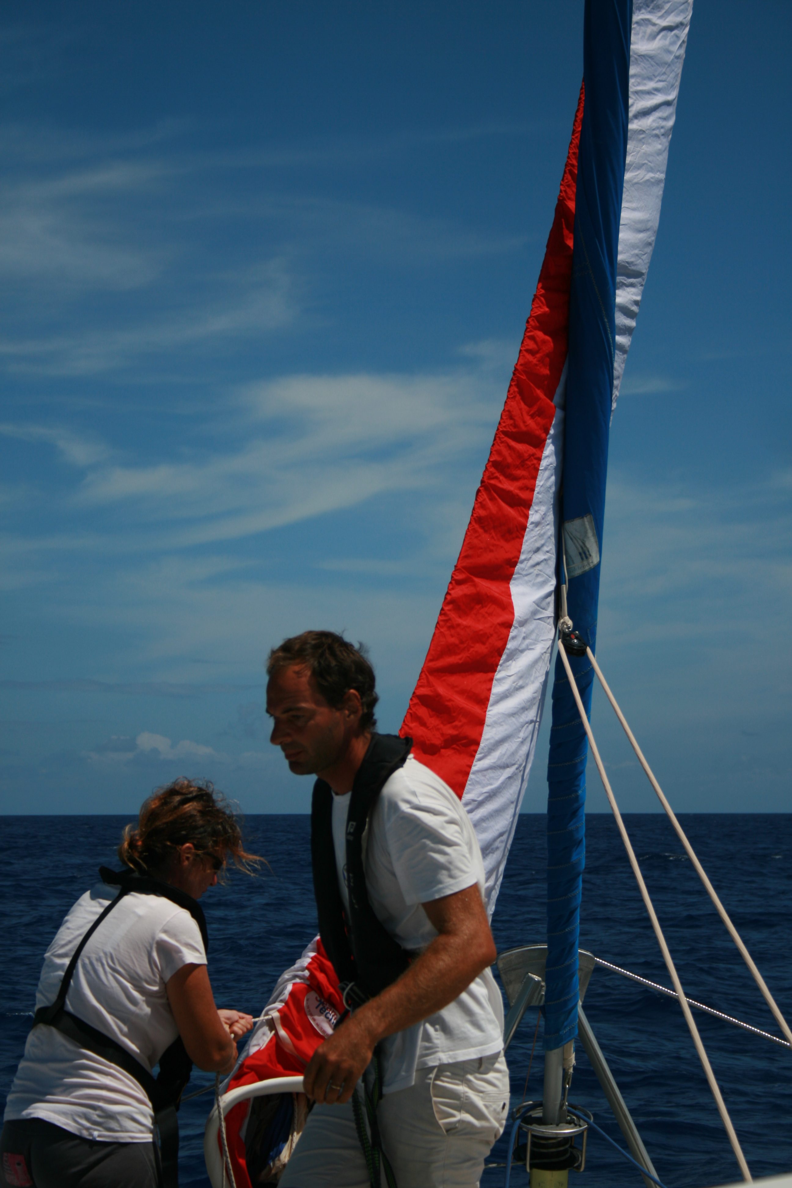 On se fait un gros stress dans une passe étroite et peu profonde (2m). Au moment ou on arrive dedans s’abat un grain cogné (rideau de pluie, vent à 40 nœuds…), on ne voit plus rien, la visiblité est catastrophique et la pluie nous fouette le visage nous empêchant d’ouvrit les yeux… Plus de peur que de mal et ça ne dure pas longtemps.