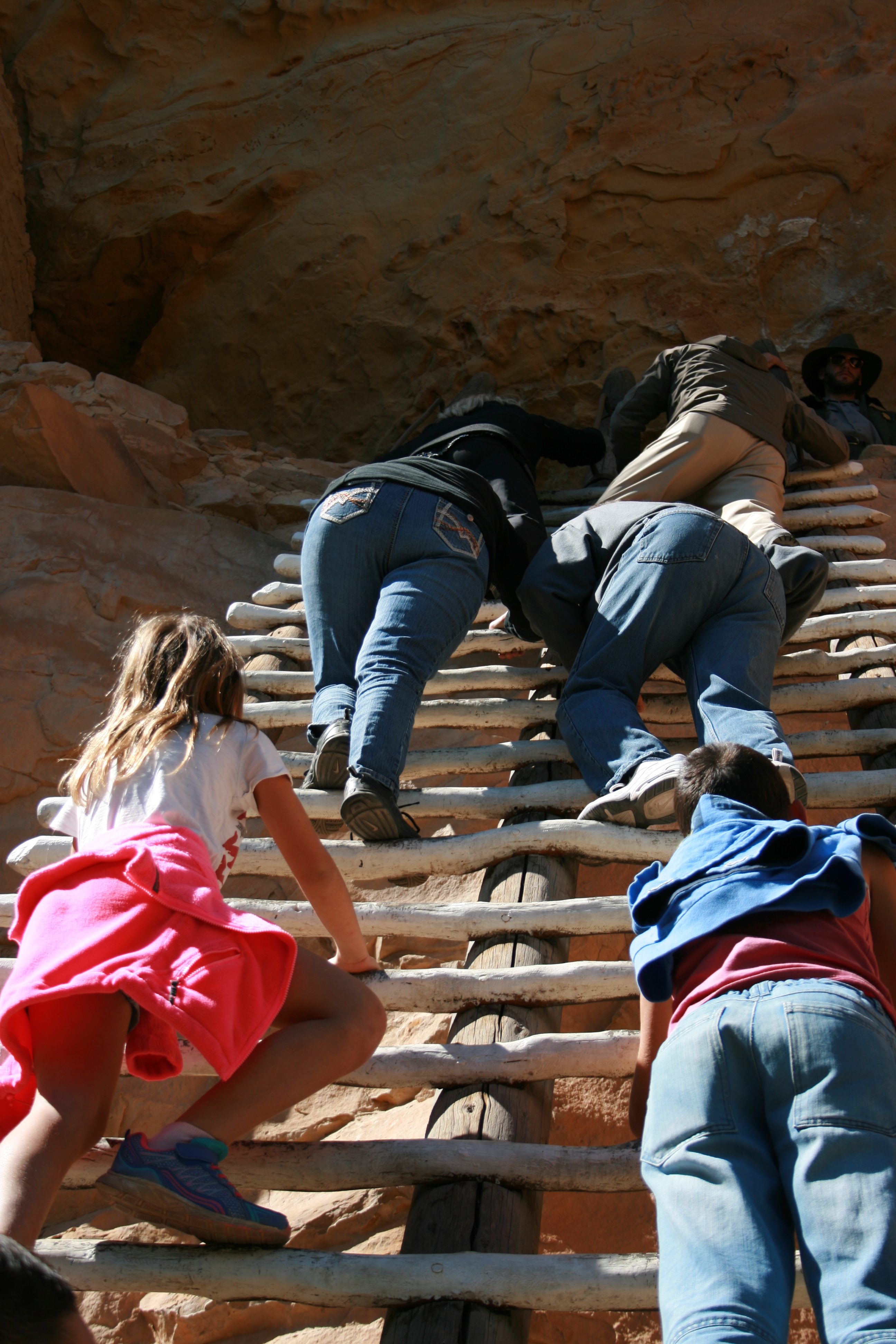 On ne change pas une équipe qui gagne ! C’est donc tout naturellement par un nouveau parc national que débute notre séjour dans ce nouvel état. Le parc national du Mesa Verde est un peu différent des autres. Mesa veut dire plateau, on commence par s’élever sur une route de montagne bordée d’une végétation basse de type aride… Le Plateau est découpé de profonds Canyons aux falaises abruptes. Les paysages sont moins spectaculaires qu’en Utah mais la raison d’être du parc est ailleurs. Toute cette région a été habité par une civilisation indienne dont on ne connaît pas grand chose : les Pueblos. Ceux-ci habitaient la région entre 500 et 1300 après JC. S’ils ont longtemps habités sur le plateau dans des constructions semi souterraines, ce sont les villages en dur construits dans les anfractuosités des falaises qui font toute la beauté du parc. On peut en découvrir certaines, c’est beau et sympa à visiter car il faut emprunter des échelles et parfois passer dans de petits tunnels… Ces villages ont été habité pendant 200 ans avant d’être abandonnés définitivement, même si, pendant les guerres indiennes, ils ont pu servir d’abris. On en reverra plus au sud, dans le Canyon de Chelly au coeur de la réserve des Navajos située dans une réserve indienne en Arizona. Une partie est toujours utilisée comme abri d’estive par quelques familles.